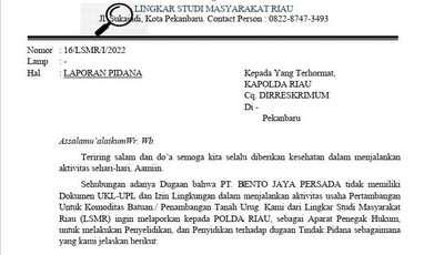 Teks poto : laporan yang telah dilayangkan ke Polda Riau pada tanggal 17 Januari 2022 silam dengan nomor surat 16/LSM/I/22 yang ditujukan ke Polda Riau.
