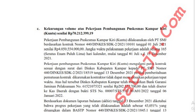 Begitu juga dengan pekerjaan pembangunan Puskesmas kampar kiri. Pekerjaan Pembangunan Puskesmas Kampar Kiri (Kuntu) dilaksanakan oleh PT SMJ berdasarkan kontrak Nomor 440/DINKES/SDK-2/2021/10101 tanggal 01 Juli 2021 senilai Rp4.050.554.000,00.