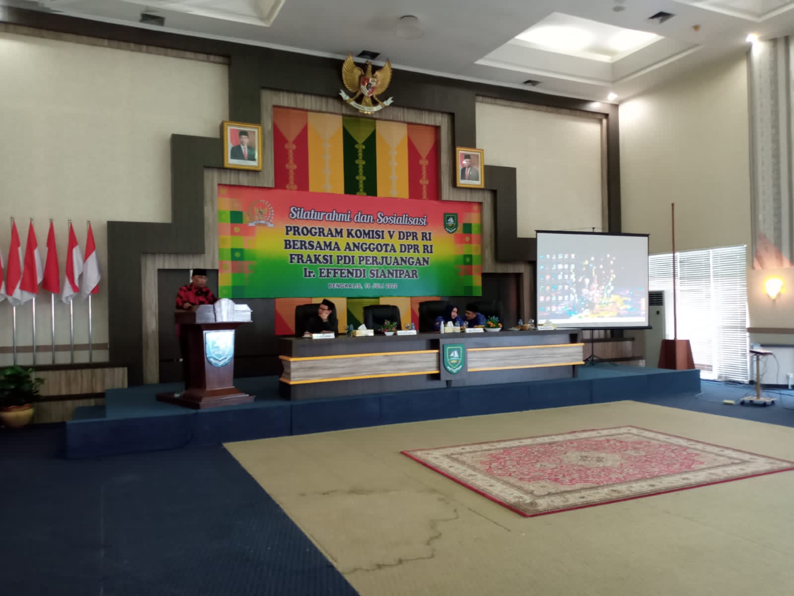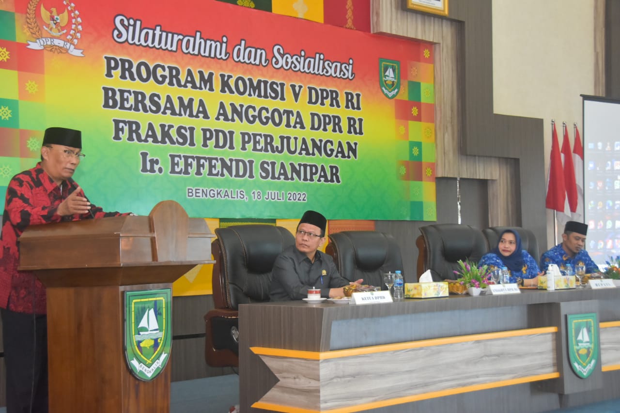 BENGKALIS - Bupati Bengkalis Kasmarni dan Wakil Bupati H Bagus Santoso mengikuti silaturahmi dan sosialisasi Program Komisi V DPR RI, bersama anggota DPR RI, Fraksi PDI Perjuangan, Ir Effendi Sianipar, Senin, 18 Juli 2022.