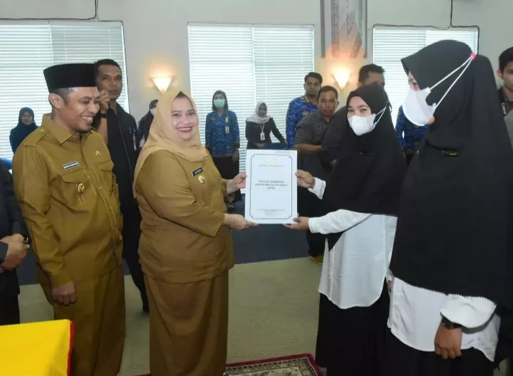 BENGKALIS - Bupati Bengkalis Kasmarni serahkan Surat Keputusan (SK) kepada 138 orang Pegawai Pemerintah dengan Perjanjian Kerja (PPPK) tahap II formasi tahun 2021, Senin, 18, Juli 2022 di ruang rapat Kantor Bupati Bengkalis.