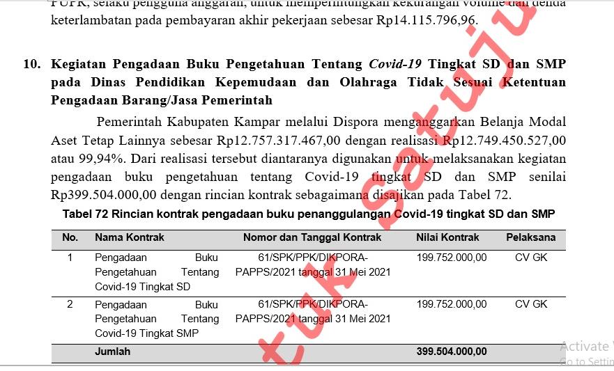 Buku Covid-19 Tingkat SD & SMP Disdikpora Kampar Tak Sesuai Ketentuan Pengadaan Barang Pemerintah