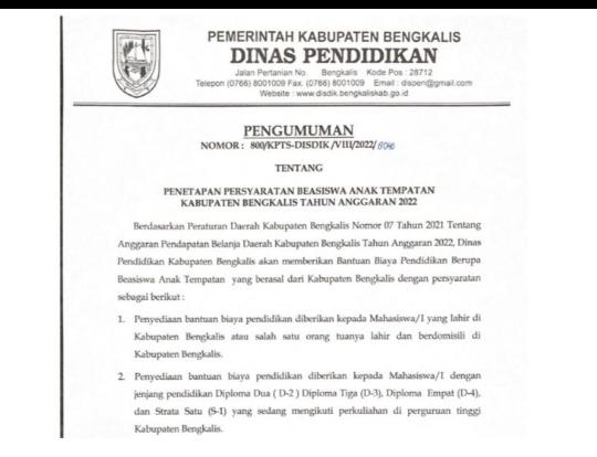 Pengumuman Disdik tentang Penetapan Persyaratan Beasiswa Anak Tempatan Kabupaten Bengkalis tertanggal 8 Agustus 2022 tersebut, ditandatangi Kholijah selaku Kepala Disdik Kabupaten Bengkalis.