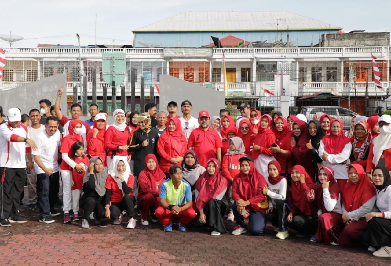 Sekda Bengkalis H Bustamy HY berfoto bersama ASN Pemkab Bengkalis usai mengikuti perlombaan memeriahkan HUT ke 77 digagas Bagian Umum Pemkab Bengkalis.