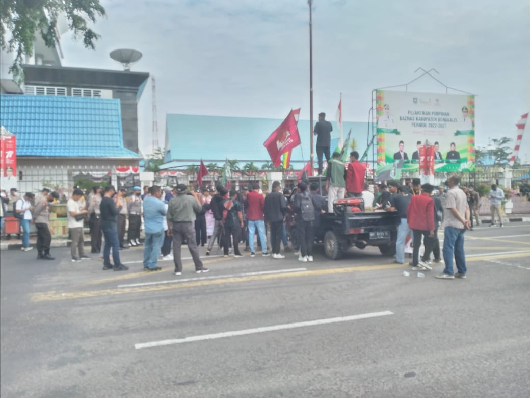 Sayangnya kedatangan sejumlah mahasiswa itu sudah diantisipasi oleh pihak Pemda Bengkalis. Terbukti mahasiswa hanya dapat berorasi di depan pintu gerbang masuk gedung karena ratusan pasukan gabungan dari Kepolisian Polresta Bengkalis, TNI dan Satpol PP, nampak berbaris melakukan pengamanan di pintu gerbang Kantor Bupati dan DPRD Bengkalis.