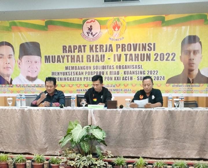 SATUJU.COM PEKANBARU - Pengurus Provinsi Muaythai Riau menyelenggarakan Rapat Kerja Provinsi IV Muaythai Riau, bertempat di Hotel Dafam Pekanbaru (14/9/22), yang di hadiri 11 pengurus Kabupaten/Kota se-Riau dengan tema "Membangun Soliditas organisasi, menyukseskan PORPROV X RIAU - KUANSING 2022 & Peningkatan Prestasi PON XXI ACEH-SUMUT 2024".