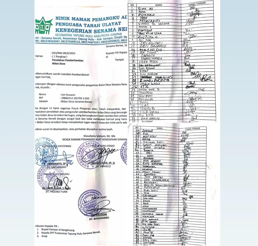 Dilain tempat sekumpulan warga juga mengatakan bahwa lima tokoh adat Desa Sinamanenek juga menolak keras akan usulan surat yang sudah dilayangkan kepala desa ke Kepala Puskesmas Tapung Hulu II.bahkan untuk mendukung Len Kuswari (Bidan Desa) kelima Tokoh Adat bersurat ke Dinas Kesehatan kabupaten Kampar dengan Nomor Surat: 032/MN-SN/IX/2022 Dengan Hal : Penolakan Pemberhentian Bidan Desa, tertanggal 16 September 2022.ini membuktikan bahwa kinerja Bidan Desa "Len Kuswari" sudah sangat optimal sesuai harapan warga.