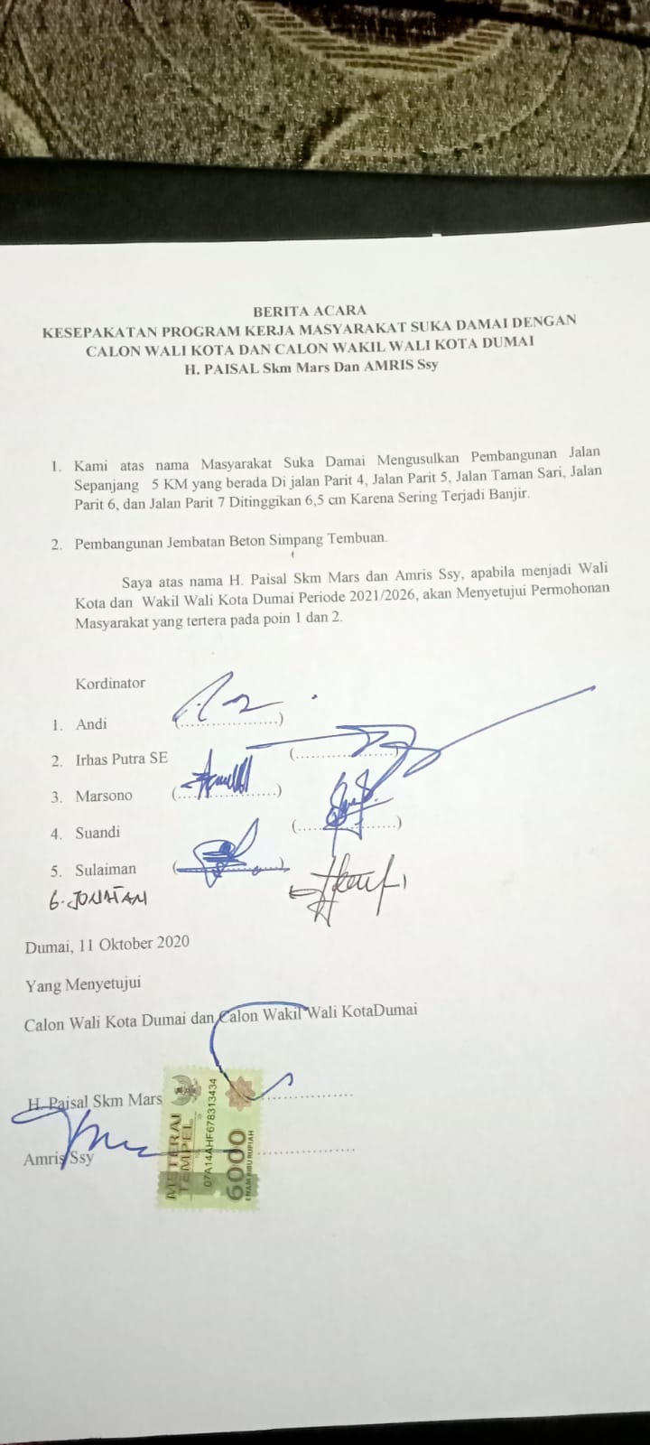 Saat itu Kontrak politik yang di tanda tangani H. Paisal S.km Mars dan Alm. Amris Ssy dengan masyarakat Sungai Sembilan sebelum menjadi walikota dan wakil walikota Dumai yang saat itu masih mengkampanye kan diri untuk mencalon kan menjadi walikota dan wakil walikota Dumai Periode 2020 - 2024 sehingga Janji - Janji di saat kampanye dengan masyarakat sekitar sungai sembilan terbaikan.