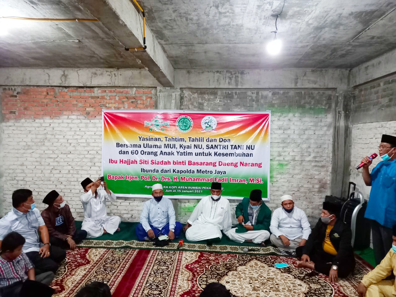 Terakhir, Jumat (15/1/2021) malam, (SantanNU) bersama ulama MUI, Kyai NU, dan 60 anak yatim, kembali menggelar acara Baca Yasin, Tahlilan dan doa bersama. Kali ini secara khusus mendoakan kesembuhan untuk Ibunda dari Kapolda Metro Jaya Irjen Pol Drs Dr H Muhammad Fadli Imron MSi, Hajjah Siti Siadah binti Basarang Daeng Narang.