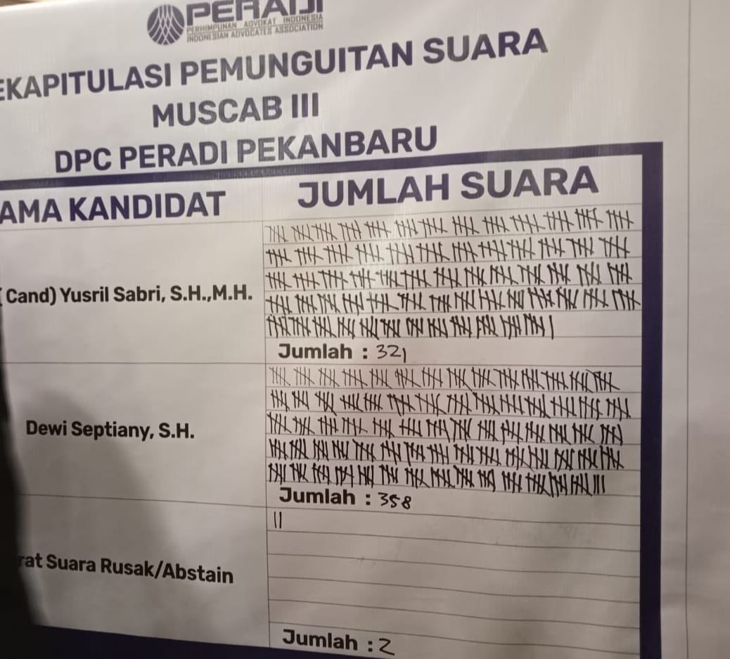 Acara yang berlangsung hingga malam hari tersebut, Dewi Septriany SH, akhirnya terpilih sebagai Ketua Perhimpunan Advokat Indonesia (Peradi) Dewan Pimpinan Cabang (DPC) Pekanbaru periode 2022-2027.