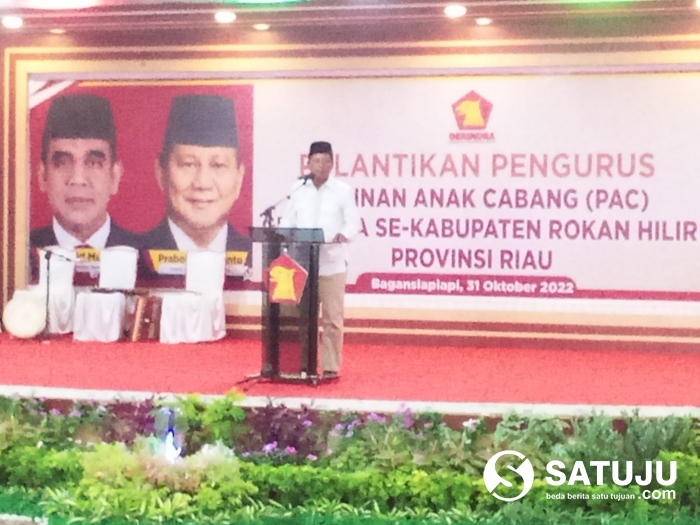 SATUJU.COM ROHIL - Pelantikan Pengurus Pimpinan Anak Cabang ( PAC ) Gerindra Se-kabupaten Bersatu Membangun Bangsa, Gerinda Menang Prabowo menjadi Presiden RI untuk untuk pemilihan umum serentak tahun 2024, Rokan Hilir, Provinsi Riau pada Senin (31/10/2022).