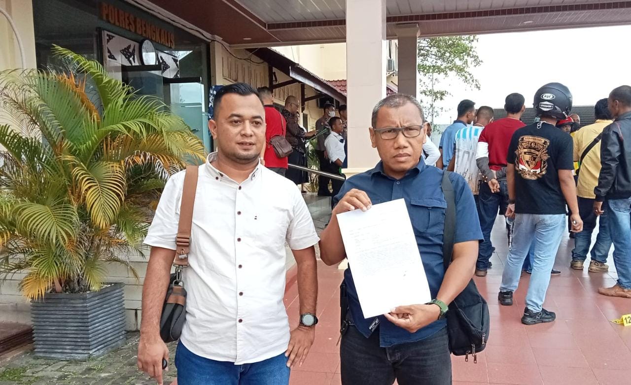 Penasehat PWI Bengkalis Dakeslim didampingi Sekretaris PWI Bengkalis Agustiawan buat pengaduan ke Polres Bengkalis