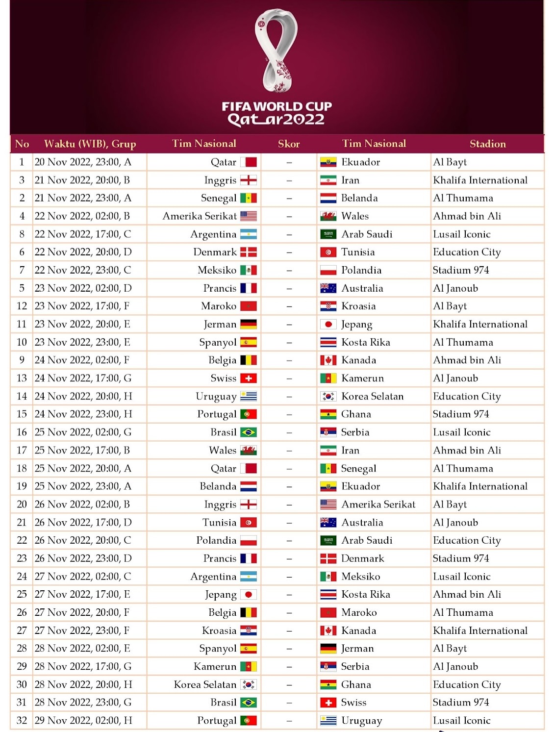Jadwal lengkap Piala Dunia 2022 di Qatar dari setiap pertandingan grup hingga final akan tersaji di akhir artikel ini.