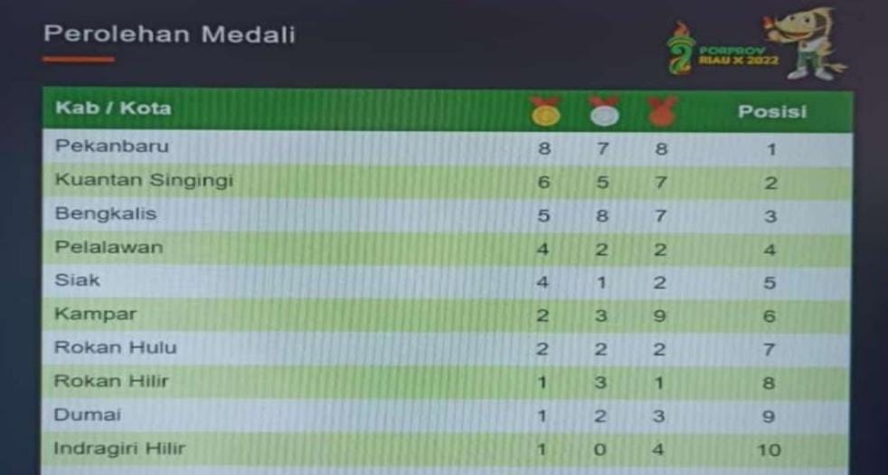 SATUJU.COM KUANSING - Perolehan medali sementara tuan rumah Kuansing, menempati posisi kedua setelah posisi pertama ditempati oleh Kota Pekanbaru dan di posisi 3 Bengkalis untuk perolehan sementara medali Porprov X Riau tahun 2022.