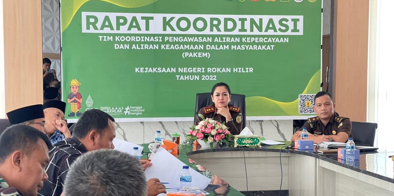 SATUJU.COM ROHIL - Tim Pengawasan Aliran Kepercayaan dan Aliran Keagamaan Masyarakat (PAKEM) Kabupaten Rokan Hilir (Rohil) kembali menggelar rapat koordinasi. Rapat tersebut secara langsung dipimpin Kajari Rohil Yuliarni Appy SH MH yang dipusatkan di kantor Kejari Rohil, Batu Enam, Bagansiapiapi, Selasa (29/11/2022).