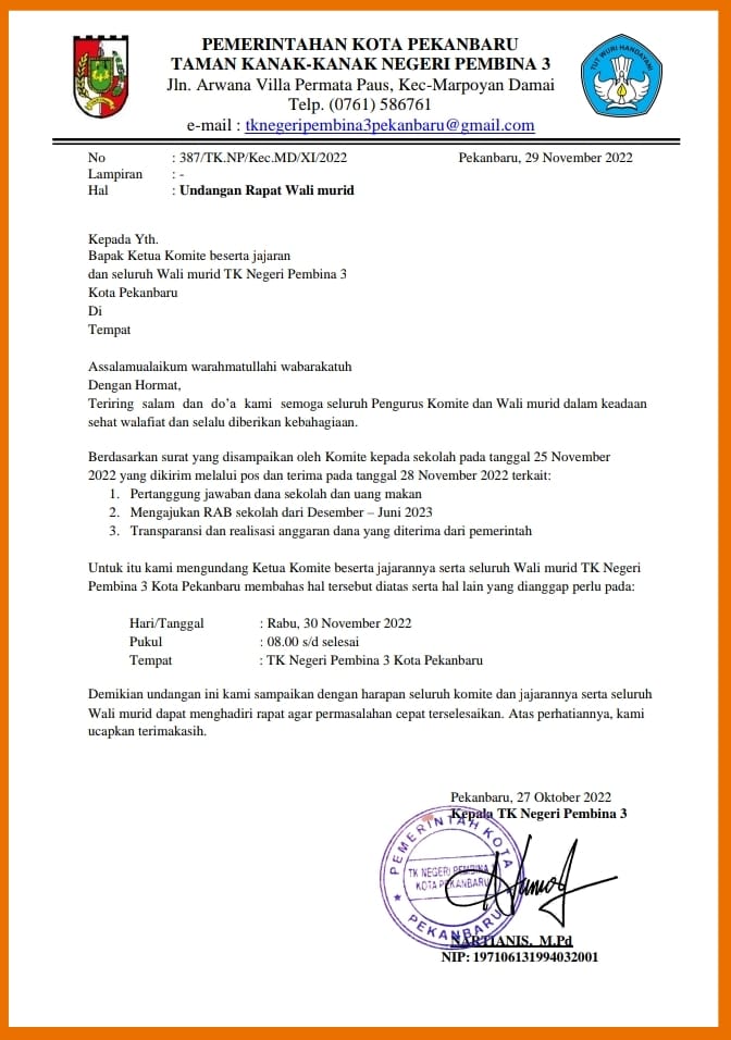 SATUJU.COM PEKANBARU - Ketua Komite dan Wali Siswa/Siswi TK Negeri Pembina 3, yang beralamat di Jalan Arwana Villa Permata Paus, Kecamatan Marpoyan Damai Kota Pekanbaru akhirnya melakukan pertemuan dengan Kepsek TK Negeri Pembina 3 Pekanbaru, terkait permasalahan Uang Sekolah dan membahas tuntutan para Wali Siswa kepada Kepsek TKN Pembina 3 Pekanbaru, pada Jum'at (25/11/2022).
