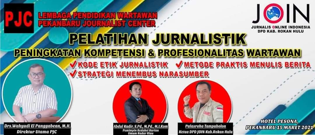 Pelatihan bertajuk: "Peningkatan Kompetensi & Profesionalitas Wartawan", itu terselenggara atas kerja sama Pekanbaru Journalist Center dengan Dewan Pimpjnan Daerah - Jurnalis Online Indobesia (DPD-JOIN) Kabupaten Rokan Hulu.