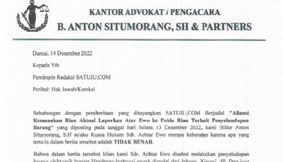 PEKANBARU, Satuju.com - Sehubungan dengan pemberitaan yang ditayangkan satuju.com Berjudul "Aliansi Kemanakan Riau Aktual Laporkan Atar Ewo ke Kapolda Riau dan Bea Cukai" yang di posting pada tanggal hari Rabu 13 Desember 2022.