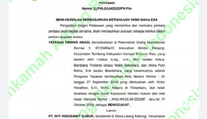 PEKANBARU, Satuju.com - Seperti diketahui Bahwa pada tanggal 19 Mei 2022 salah Yayasan lingkungan yang ada di Provinsi Riau menggugat PT Inti Indosawit dimana telah merambah kawasan hutan seluas kurang lebih dua ribu hektar didalam kawasan hutan produksi yang dapat dikonversi (HPK) dan kawasan hutan produksi tetap (HP) yang berada di Desa lalang Kabung, Kecamatan Pelalawan, Kabupaten Pelalawan.