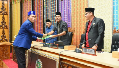 Teks foto: Ketua Pansus LKPJ Rianto Saat Menyerahkan Laporan LKPJ.