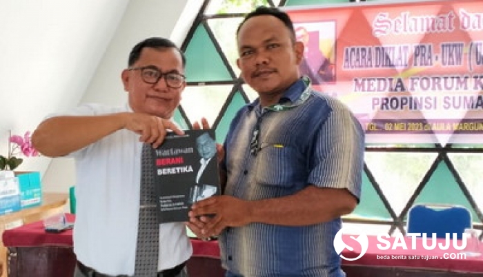 BATANGTORU, Satuju.com - Pembicara Nasional yang juga Direktur Utama, Lembaga Pendidikan Wartawan, Pekanbaru Journalist Center (PJC), Drs. Wahyudi El Panggabean, M.H., memberi motivasi masalah jurnalis kepada puluhan wartawan Sumatera Utara, Selasa (2/5).