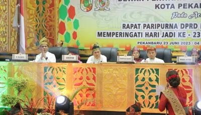 Untuk diketahui, hari ini merupakan HUT Kota Pekanbaru ke-238. DPRD Pekanbaru menggelar rapat paripurna yang disaksikan oleh Wakil Gubernur Riau, Pj Walikota, anggota DPRD Provinsi Riau serta pejabat di lingkungan Pemko maupun Pemprov.(Adv/red)