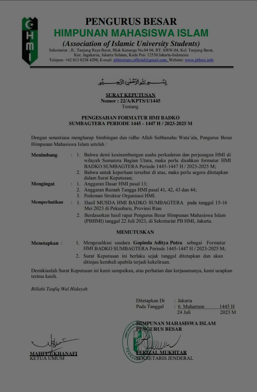 Surat Keputusan nomor : 22/A/KPTS/1/1445