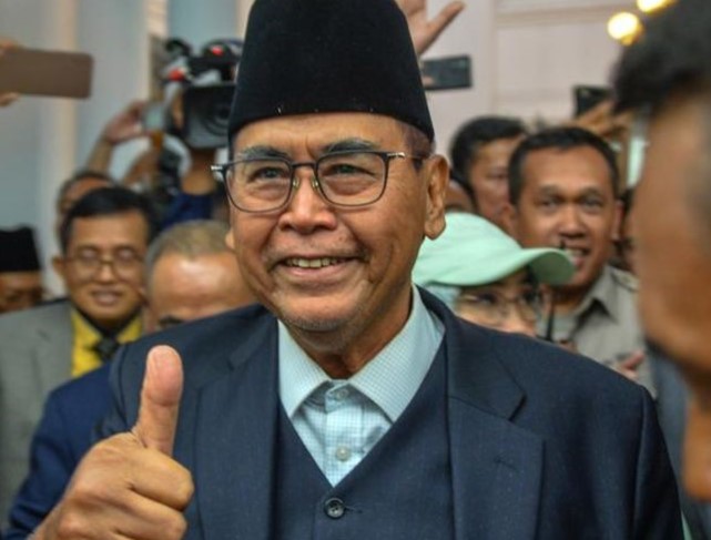 Panji terlihat mengenakan setelan kemeja abu-abu dengan peci berwarna biru. Dikawal kuasa hukumnya, Panji tampak mengacungkan jempolnya ke wartawan.