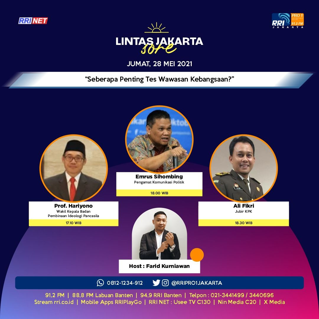 Pernyataan tersebut disampaikan oleh Emrus saat menjadi narasumber Dialog Lintas Jakarta Sore dengan tema Penting Tes Wawasan Kebangsaan? Yang di taja Radio Republik Indonesia (RRI), Kamis (28/5/21).