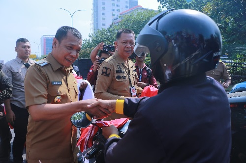 Penjabat (Pj) Wali Kota Pekanbaru Muflihun membagikan seribu bendera di Jalan Jenderal Sudirman