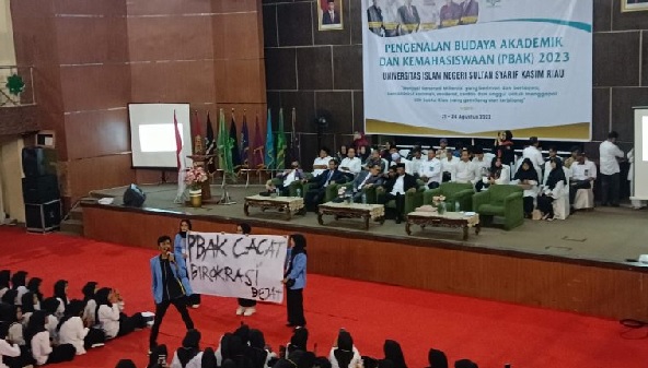 Dewan Eksekutif Mahasiswa UIN Suska Riau (Dema-U) mewarnai Kegiatan Pengenalan Budaya Akademik dan Kemahasiswaan (PBAK) tingkat universitas, di UIN SUska Riau dengan membentangkan spanduk yang mengkritisi