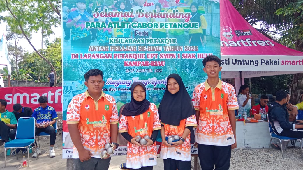 Kampar, Satuju.com - Dari tiga nomor yang di pertandingkan yaitu di nomor triple pelajar double pelajar dan nomor Essence tahun 2023. Federasi Olahraga Petanque Indonesia (FOPI) Bengkalis meraih medali emas dan perak di nomor pelajar dan berlangsung pertandingan di nomor Eksekutif kandas di babak semifinal final dan mendapatkan Perunggu.