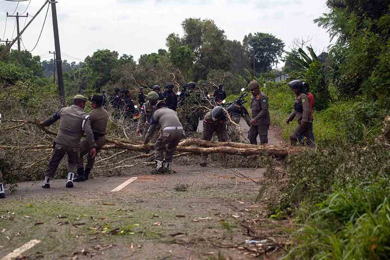 Sejumlah petugas yang tergabung dalam Tim Terpadu membersihkan pemblokiran jalan yang dilakukan oleh warga Pulau Rempang