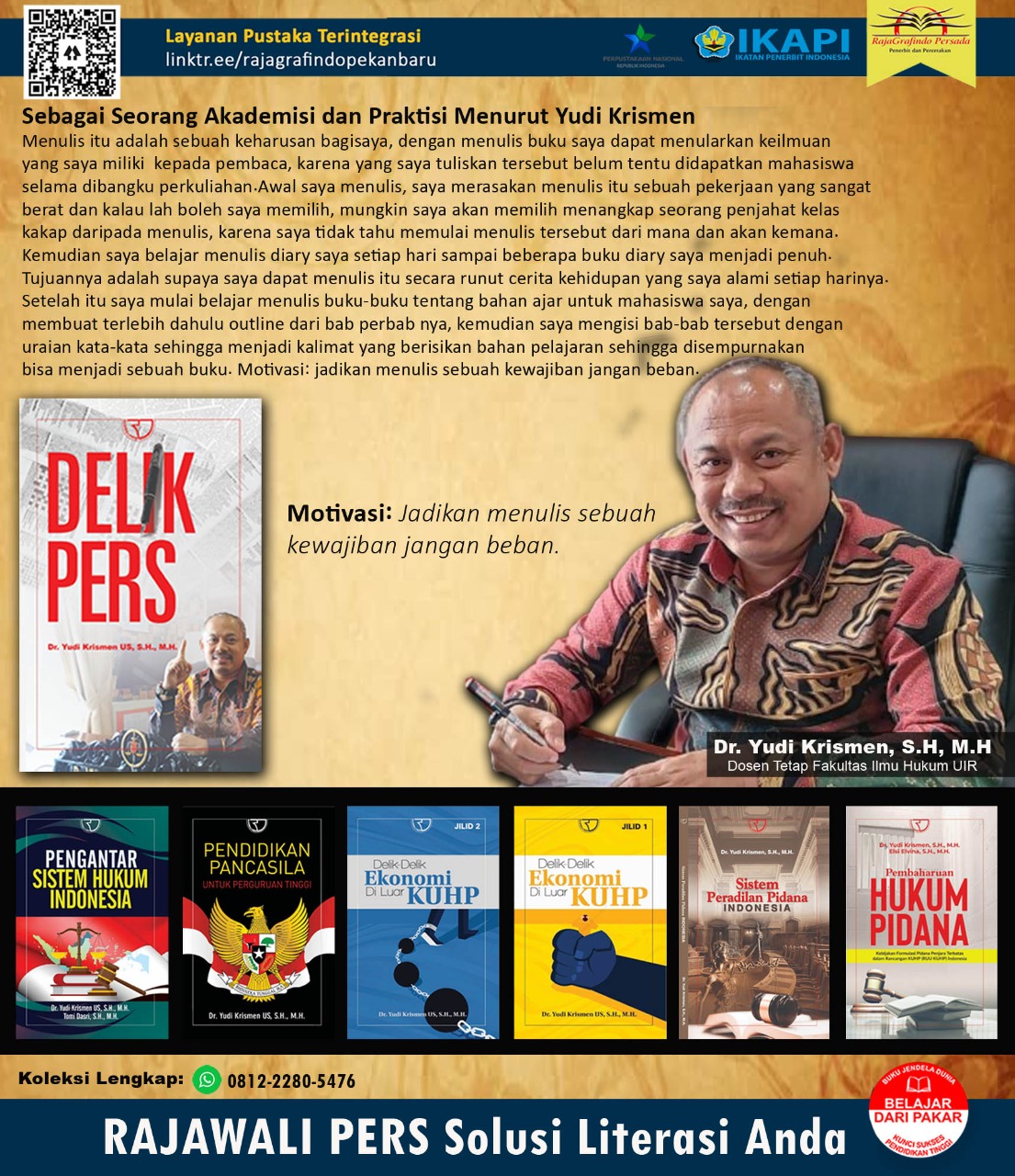 Dr. YK sapaan akrabnya, buku ini dipersiapkan terutama untuk calon wartawan yang akan menggeluti profesi jurnalistik, karena sepanjang pengalamannya sebagai Advokat di Riau banyak wartawan tersandung dalam menjalankan profesinya dengan masalah hukum yang dapat menjerat insan pers dengan pidana.