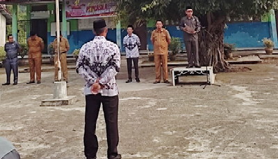 Kepala Desa Muntai pimpin langsung upacara sebagai inspektur upacara di halaman SDN 04 Bantan Desa Muntai Kabupaten Bengkalis.