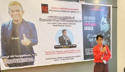 PEKANBARU, Satuju.com - Hari Sabtu (21 Oktober) Whiz Prime Hotel Pekanbaru. Di aula hotel yang megah itu, Wartawan Senior sekaligus sang Mahaguru Jurnalis, Wahyudi El Panggabean,.tengah meluncurkan karyanya berupa buku.