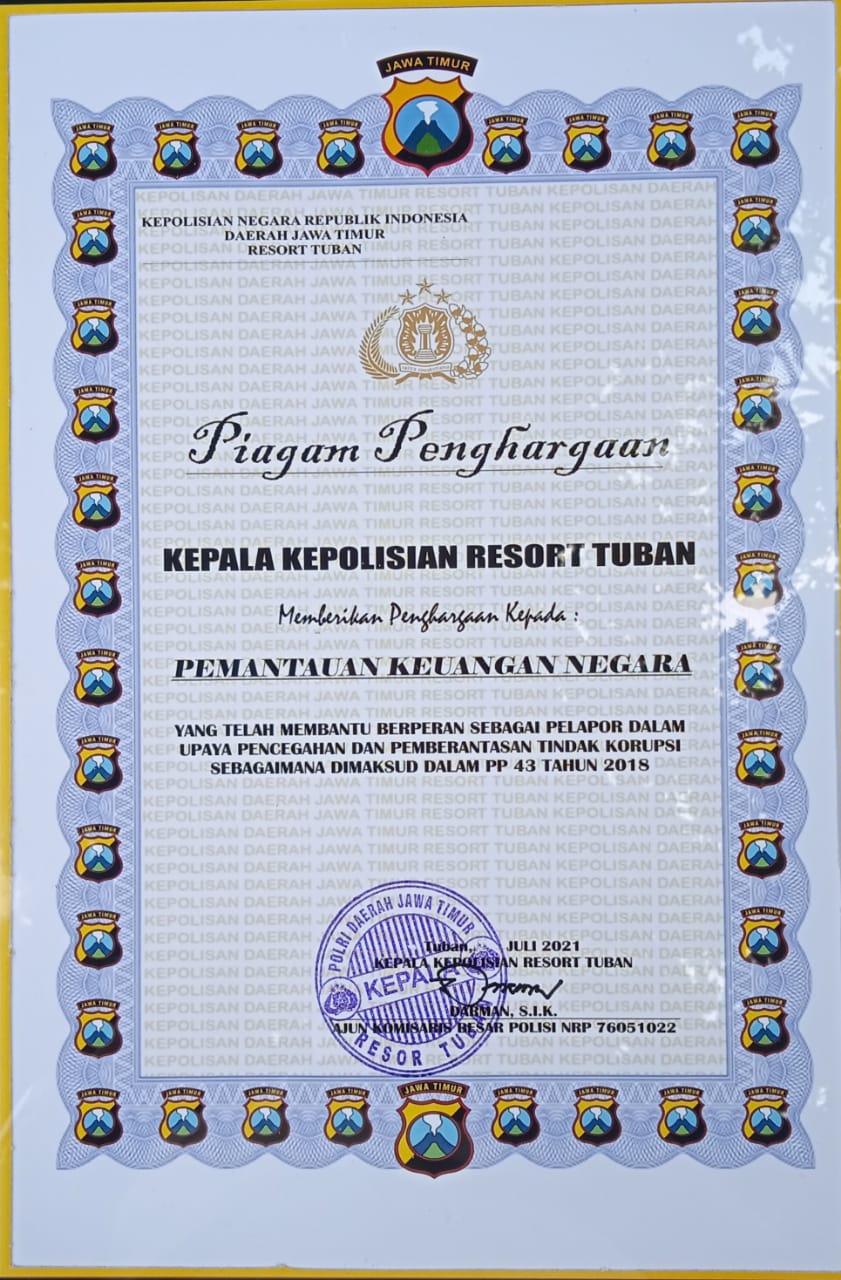 Tuban, (Jawa Timur) - Patar Sihotang SH MH Ketua Umum Pemantau Keuangan Negara (PKN) menyampaikan Kepada media bahwa PKN telah menerima Penghargaan dari Kapolres Tuban Bapak AKBP Darman S.I.K yang di serahkan melalui Kasat Reskrim AKP M Adi Makayasa S.I.K S.H. M.I.K di kantor Polres Tuban Jl Dr Wahidin Tuban pada Hari kamis 22-07-2021 jam 13.00 WIB.