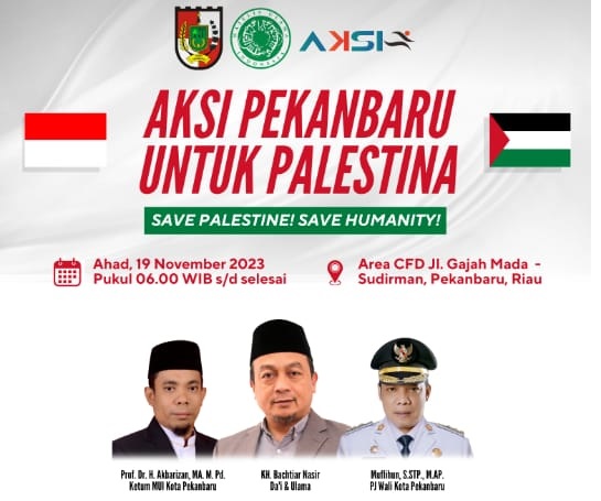 Pekanbaru, Satuju.com - Aksi Bela Palestina akan digelar Pemerintah Kota (Pemko) Pekanbaru bekerja sama dengan MUI di kawasan Car Free Day (CFD) di Jalan Gajah Mada, Minggu 19 November 2023.