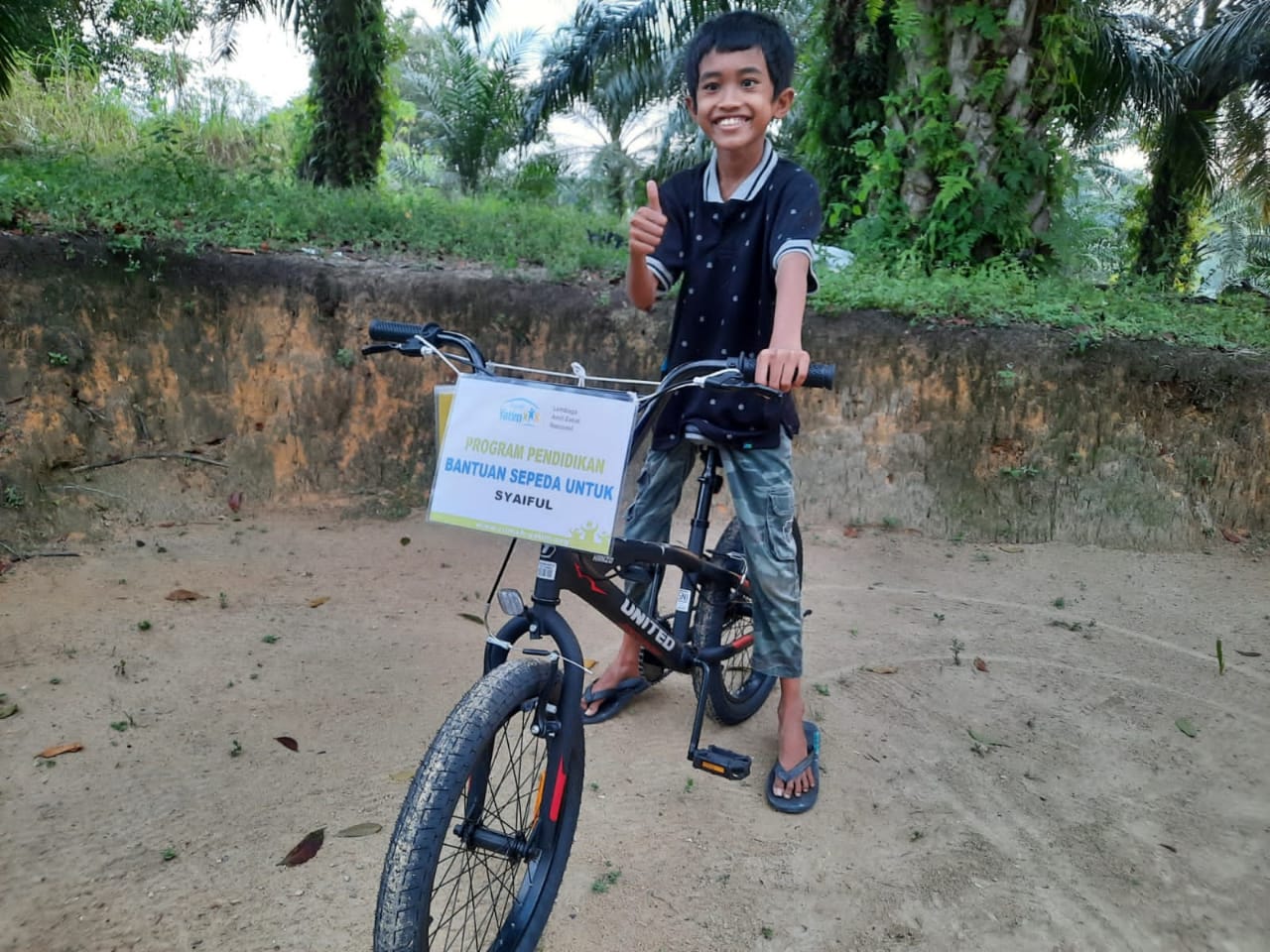 "Sepeda ini nantinya semoga bisa membuat dek Syaiful semakin semangat berangkat sekolahnya", terang Rizky, relawan Rumah Yatim.