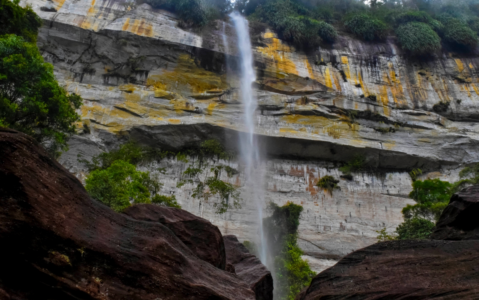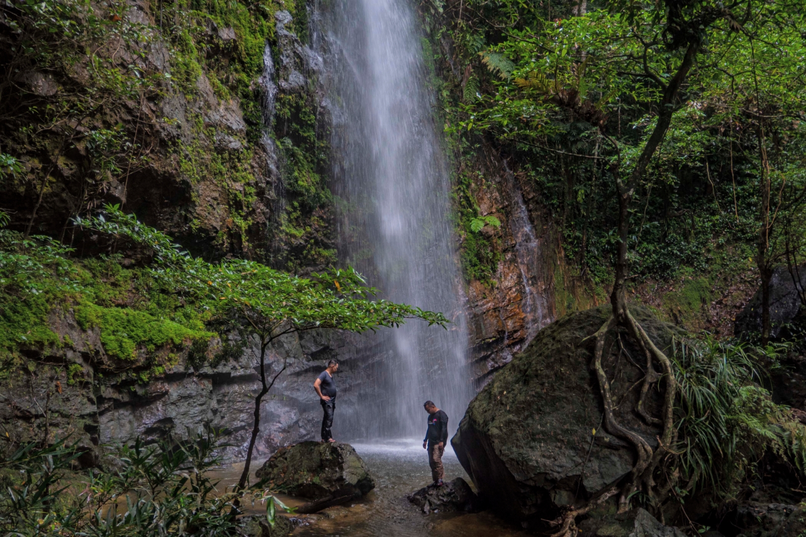 Sampai di air terjun, dinding batu di balik air terjun menjadi pemandangan khas di lokasi ini. Di mana batu-batu berukuran masif bertumpuk-tumpuk di sisi bawah. Di sini ada beragam jenis tumbuhan liar yang menyembul dari celah batu. Butir-butir air memercik ke segala arah, menjadikan udara sekitar sejuk dan lembab.
