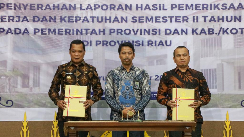 LHP pengadaan barang dan jasa semester II diserahkan BPK Riau kepada para ketua DPRD dan kepala daerah kabupaten/kota. Pj Wali Kota Muflihun dan Ketua DPRD Pekanbaru Sabarudi menerima LHP dari Kepala BPK Riau Jariyatna.