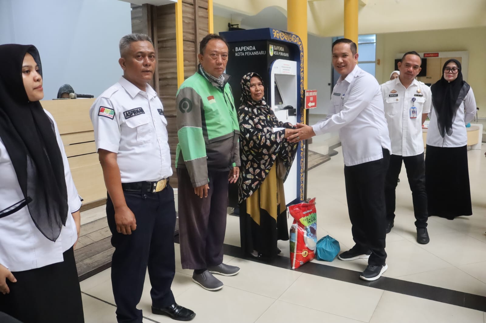 BapendaKepala Bapenda Kota Pekanbaru, Alek Kurniawan SP MSI mendistribusikan secara simbolis kepada penerima Zakat di Lobby Bapenda Kota Pekanbaru