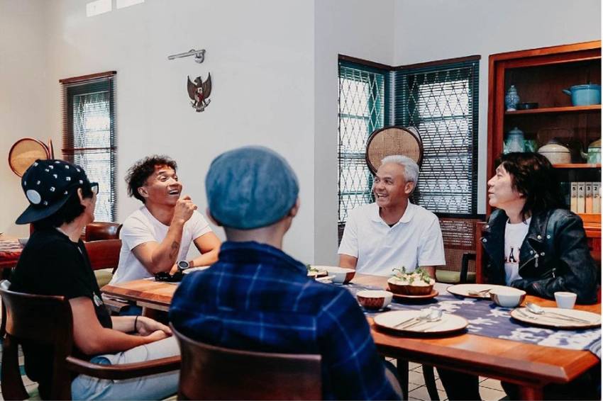 Jamuan makan siang itu pun diawali dengan momen jabatan tangan antara Ganjar dan para personel Slank. Mereka pun ikut berbincang hangat bersama Capres yang diusung Partai PDIP dan Partai Perindo ini.