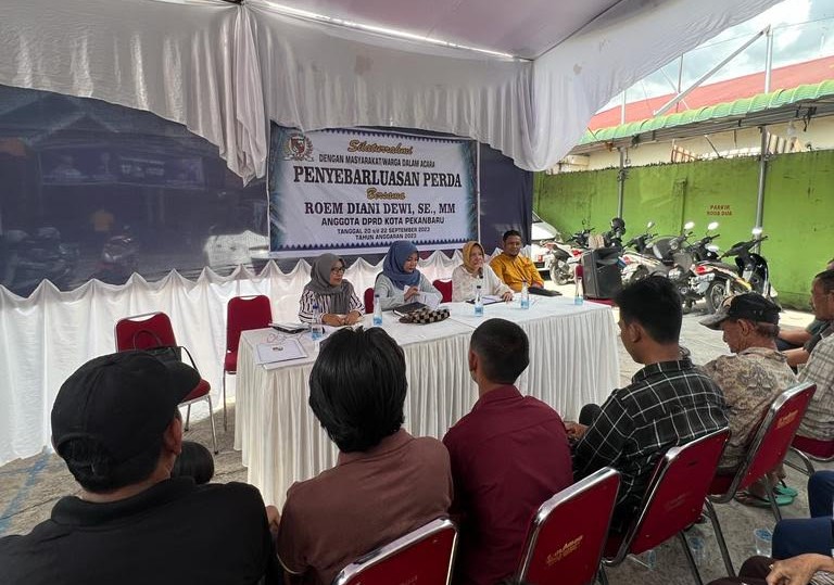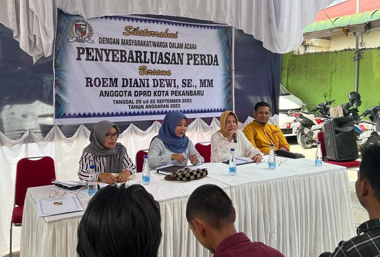 Pekanbaru, Satuju.com - Penyebarluasan Perda kota Pekanbaru dilaksanakan Anggota DPRD Kota Pekanbaru, Roem Diani Dewi pada Jumat (22/9/2023) sore di Jalan Kamboja gang Dakwah RT 02 RW 02 Kelurahan Sukajadi Kecamatan Sukajadi.