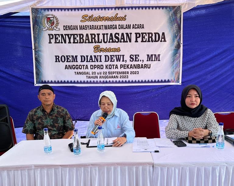 Pekanbaru, Satuju.com - Anggota DPRD Kota Pekanbaru, Roem Diani Dewi dari Fraksi Demokrat melaksanakan sosialisasi Perda kepada masyarakat di Jalan Tanjung Datuk gang Bertuah RT 01 RW 05 Kelurahan Tanjung Rhu Kecamatan Limapuluh pada Kamis (21/9/2023) pagi.