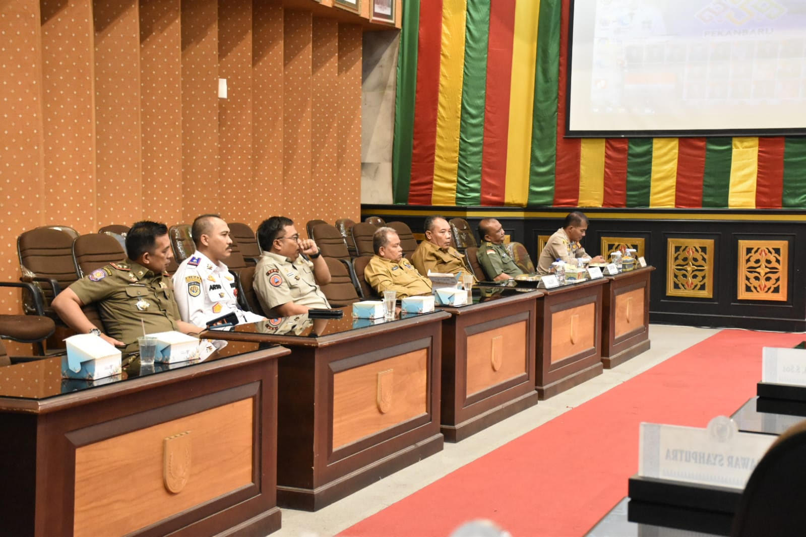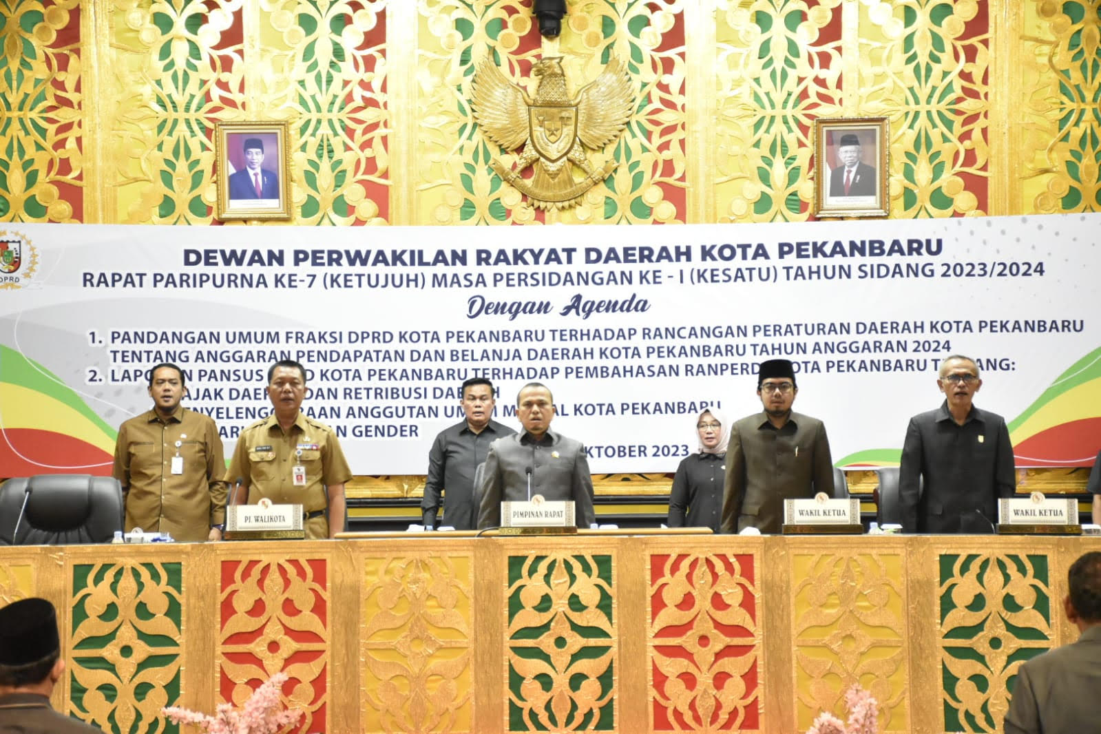Ketua DPRD Kota Pekanbaru bersama Wakil dan Sekda Pekanbaru saat menyanyikan lagu Indonesia Raya