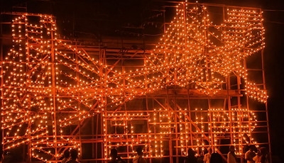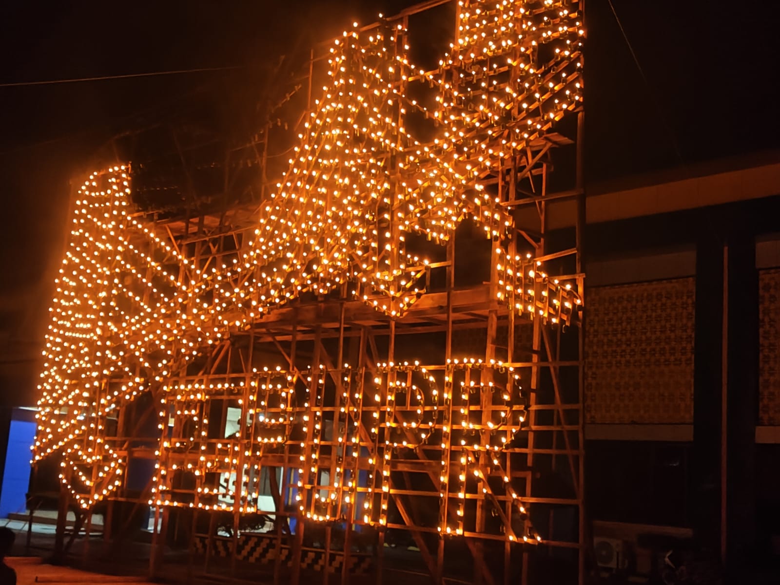 Festival Budaya Lampu Colok tahun 1445 Hijriyah/ 2024 Masehi, Dinas Pekerjaan Umum dan Penataan Ruang (PUPR) Kabupaten Bengkalis tampilkan satu menara dihalaman kantor dengan menampilkan gambar jembatan pulau Sumatera yang dihiasi sebanyak 3000 lampu colok.
