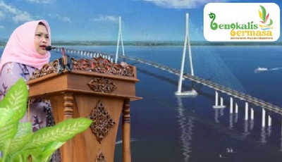 Background jembatan Bengkalis - Bukit Batu, Bupati Bengkalis Kasmarni dan logo program unggulan bermasa.