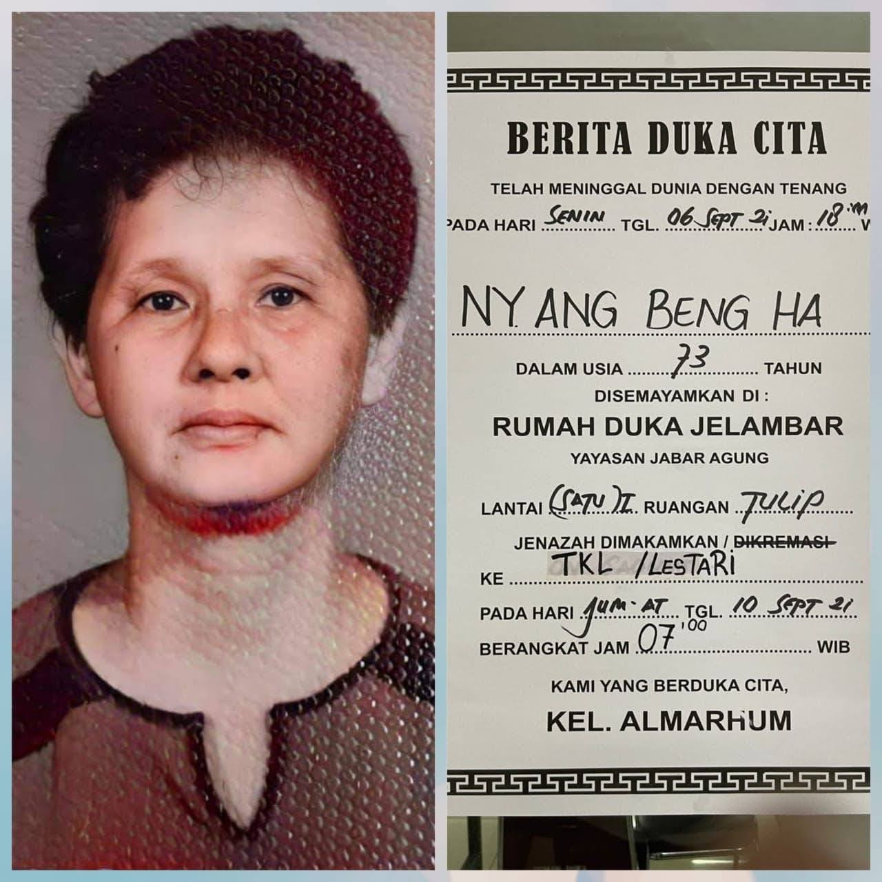 Jakarta, satuju.com - Meninggal dunia atau yang diistilahkan dengan kematian adalah kepastian. Tommy sebagai putra dari almarhumah Ang Beng Ha berduka cita mendalam atas kepergiannya.