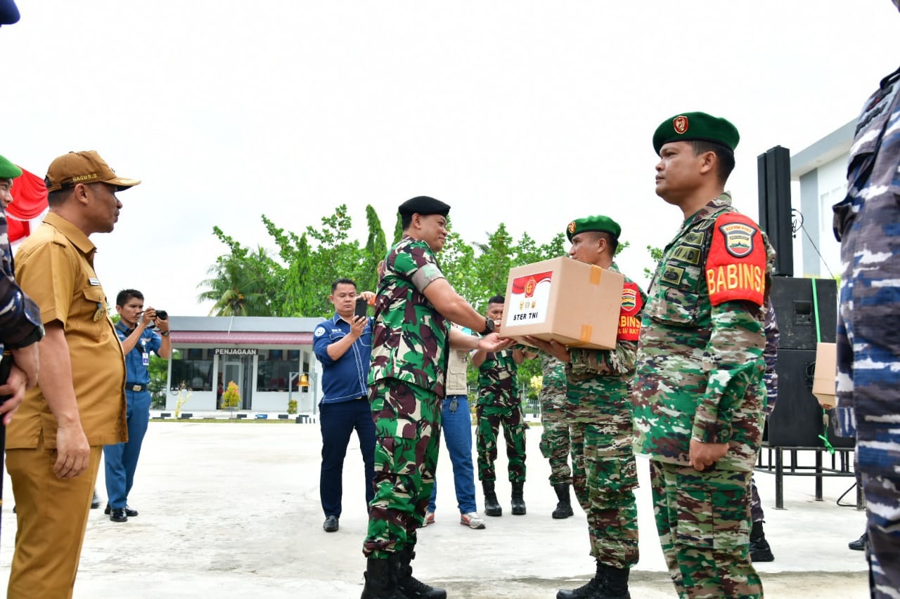 Bengkalis, Satuju.com - Bupati Bengkalis Kasmarni, wakil Bupati H Bagus Santoso menghadiri seremonial Pelepasan serta Penyerahan Bantuan Sosial kepada Masyarakat Pulau Rupat, dalam program Pembinaan Fungsi Perbatasan Wilayah Nasional (Binfungtaswilnas) tahun 2024, oleh Aster Panglima TNI Mayjen TNI Novi Helmy Prasetya , SIP, MIP, representasi Paban VI/Taswilnas Ster Kolonel TNI Laut (P) Arief Budiman, M.Tr.Opsla, di Halaman Mako Lanal Dumai, Selasa, 7 Mei 2024.