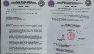 Siak, Satuju.com - DPC (Dewan Pimpinan Cabang) FSPTI-KSPSI (Federasi Serikat Pekerja Transportasi Indonesia – Konfederasi Serikat Pekerja Seluruh Indonesia) Kabupaten Siak telah menyerahkan surat pelarangan keras penggunaan Nama dan Merek FSPTI secara pribadi maupun kelompok terhadap Marudut Pakpahan yang selama ini menjadi oknum terjadinya konflik FSPTI- KSPSI di Kabupaten Siak.